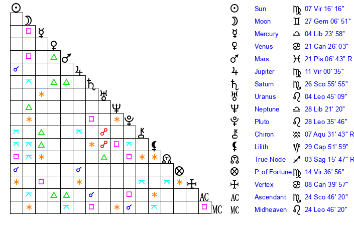 | Sun | 7 Virgo 16 | 7 Virgo 34 | 15 Scorpio 16 |
