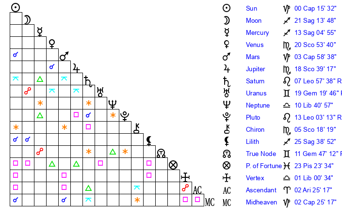 | Sun | 0 Capricorn 15 | 1 Capricorn 6 | 20 Pisces 17 |