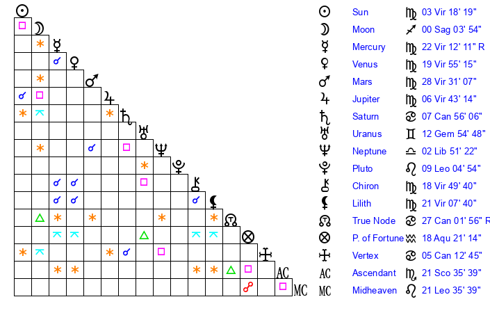 | Venus | 19 Virgo 56 | 1 Leo 13 | 29 Sagittarius 16 |
