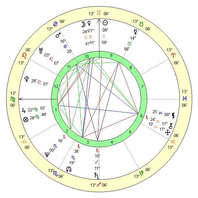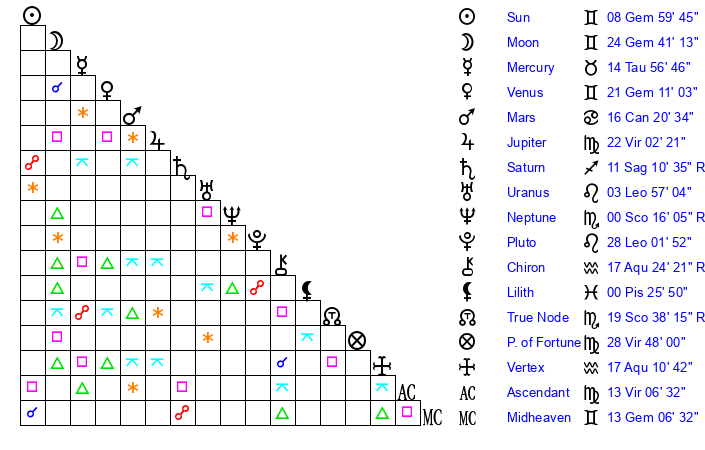 | Sun | 9 Gemini 0 | 9 Gemini 32 | 13 Leo 56 |