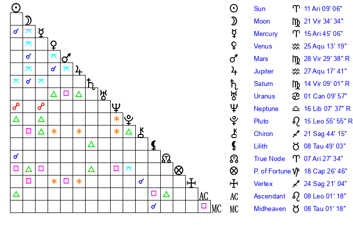 | Moon | 21 Virgo 37 | 24 Taurus 10 | 21 Gemini 33 |