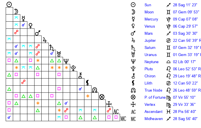 | Sun | 28 Sagittarius 11 | 29 Sagittarius 4 | 22 Pisces 15 |