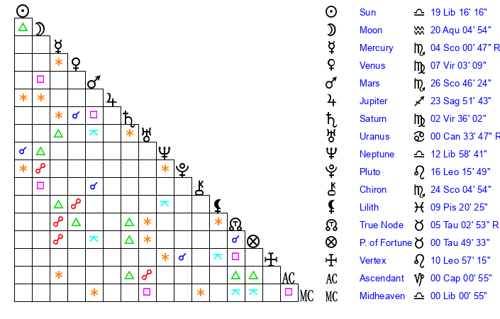 | Neptune | 12 Libra 59 | 0 Aries 13 | 15 Libra 4 |