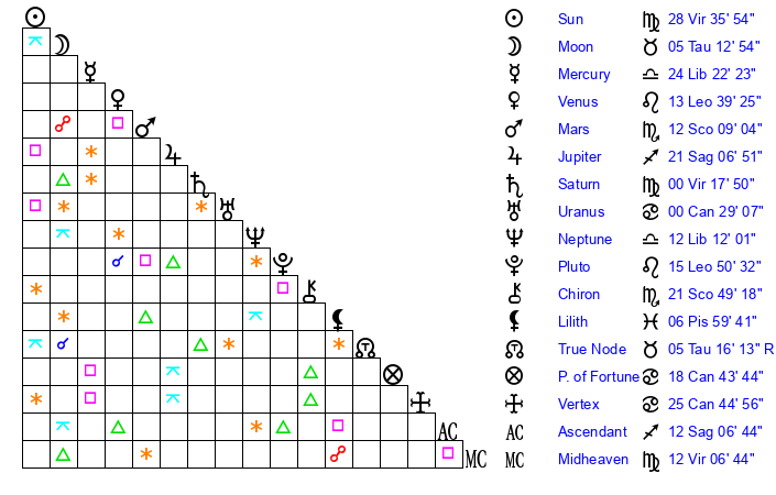| Moon | 5 Taurus 16 | 27 Virgo 27 | 6 Pisces 10 |