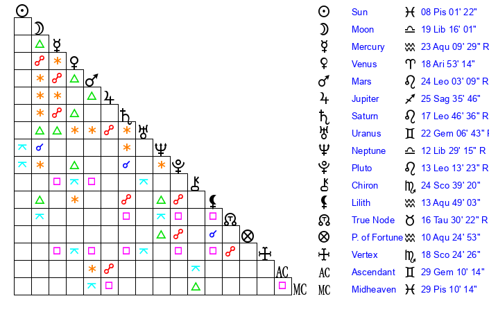 | Neptune | 12 Libra 29 | 28 Pisces 50 | 10 Libra 34 |