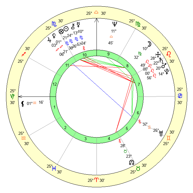 | Moon | 10 Virgo 28 | 16 Gemini 2 | 11 Cancer 5 |