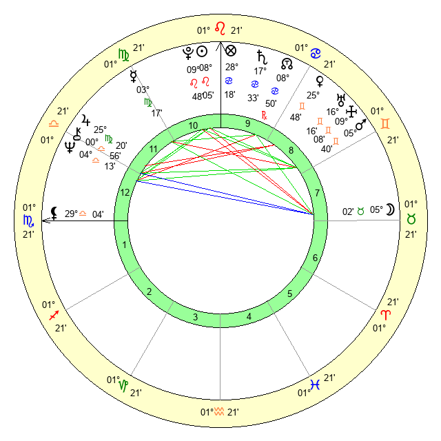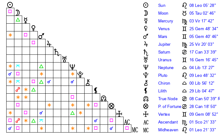 | Pluto | 9 Leo 48 | 2 Aquarius 25 | 11 Leo 40 |
