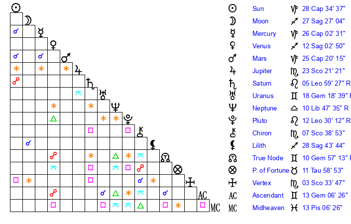 | Sun | 28 Capricorn 35 | 29 Capricorn 40 | 16 Aries 50 |