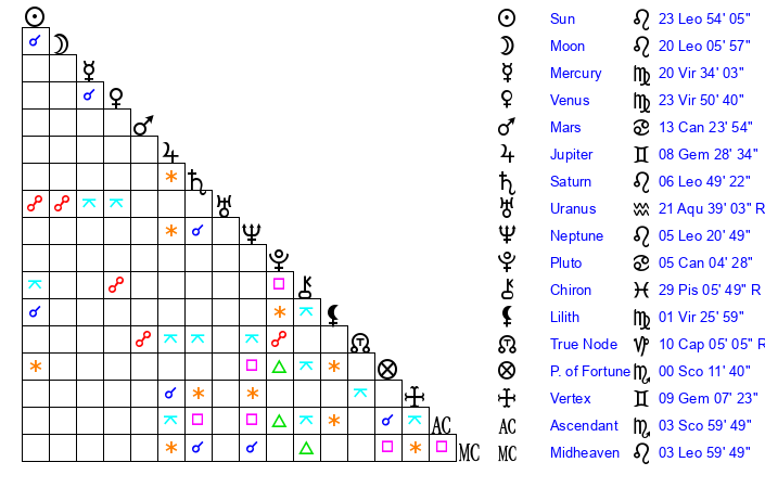 | Neptune | 5 Leo 21 | 1 Aries 41 | 6 Leo 57 |