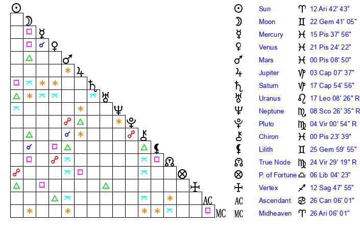 Sun | 12 Aries 42 | 12 Aries 57 | 15 Gemini 43 |