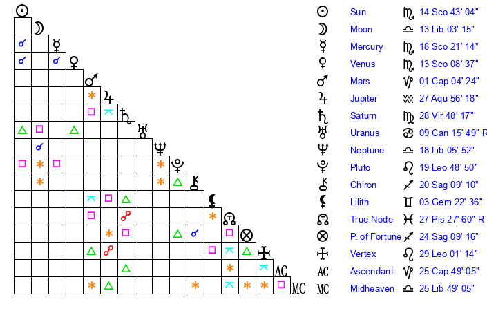 | Venus | 13 Scorpio 9 | 0 Scorpio 57 | 17 Aquarius 20 |