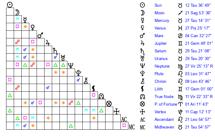 | Sun | 12 Taurus 37 | 13 Taurus 30 | 2 Leo 6 |