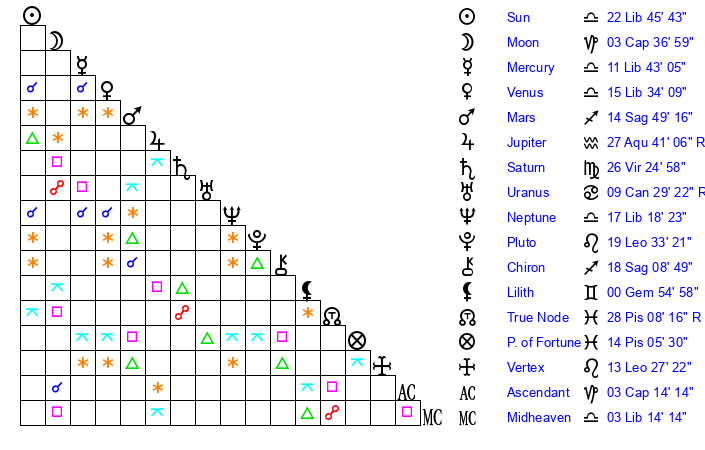 | Venus | 15 Libra 34 | 3 Libra 30 | 19 Capricorn 45 |