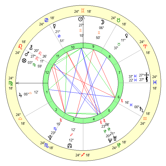 | Moon | 6 Gemini 53 | 22 Pisces 22 | 10 Leo 19 |