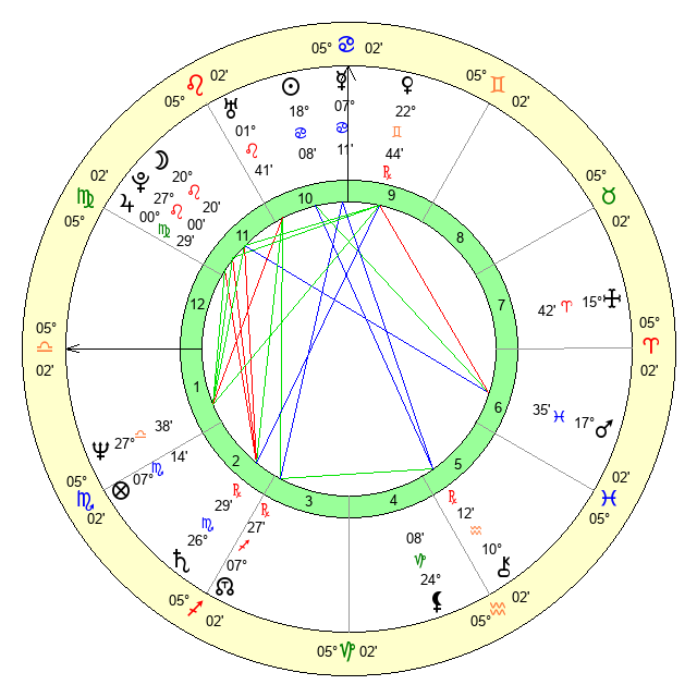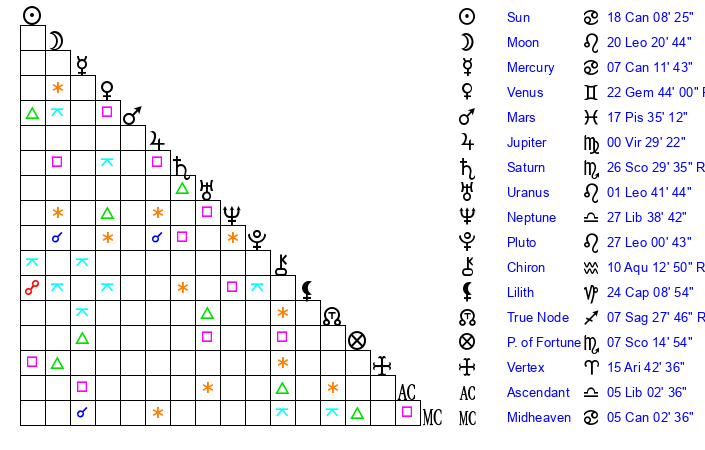 | Sun | 18 Cancer 8 | 18 Cancer 27 | 24 Virgo 31 |