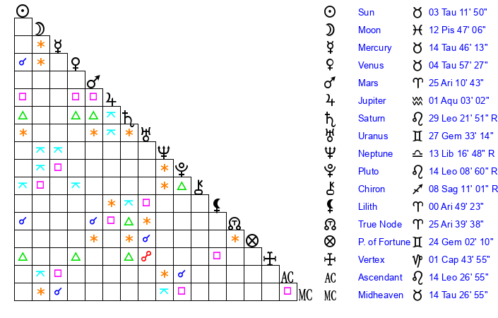 | Saturn | 29 Leo 53 | 27 Pisces 0 | 3 Virgo 31 |