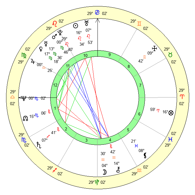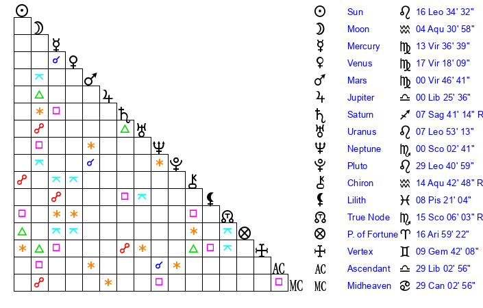 | Pluto | 29 Leo 40 | 2 Aquarius 13 | 1 Virgo 44 |