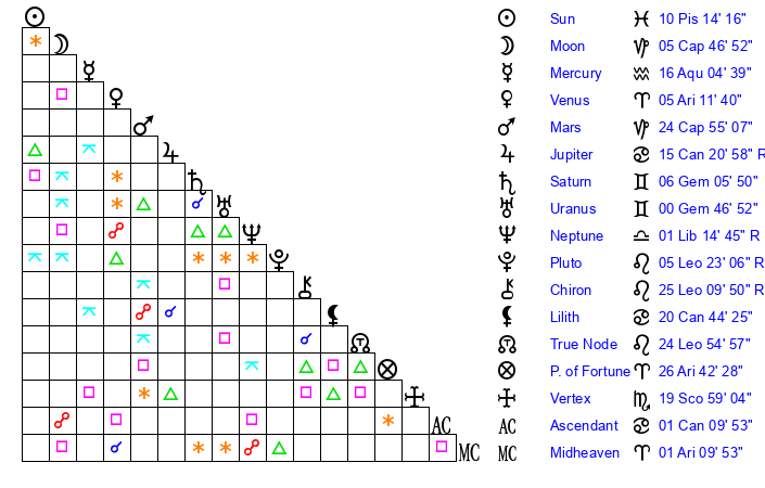 | Sun | 10 Pisces 15 | 11 Pisces 22 | 0 Gemini 43 |