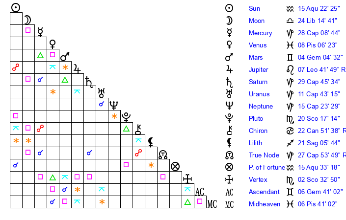 | Moon | 24 Libra 15 | 7 Taurus 55 | 14 Capricorn 5 |