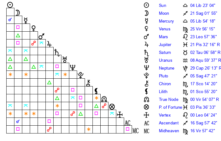 | Pluto | 5 Sagittarius 47 | 1 Aquarius 25 | 6 Sagittarius 33 |