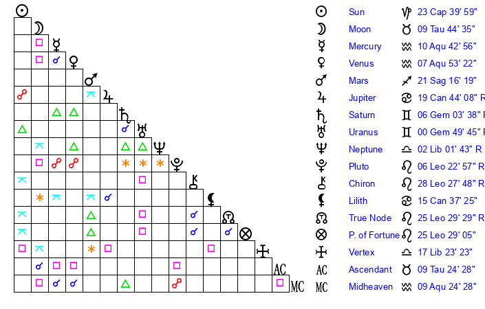 | Mercury | 10 Aquarius 43 | 9 Capricorn 9 | 18 Aries 34 |