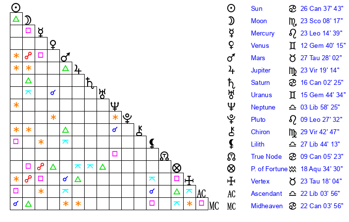 | Sun | 26 Cancer 38 | 27 Cancer 16 | 14 Libra 4 |