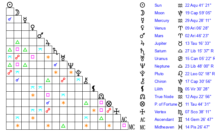 | Sun | 22 Aquarius 41 | 23 Aquarius 13 | 4 Taurus 12 |