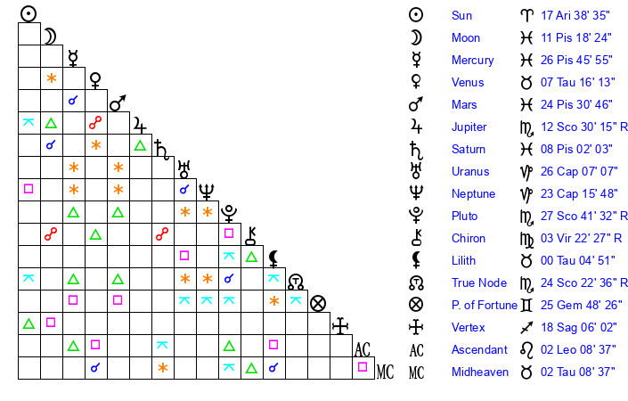 | Saturn | 7 Pisces 55 | 25 Pisces 12 | 10 Pisces 38 |