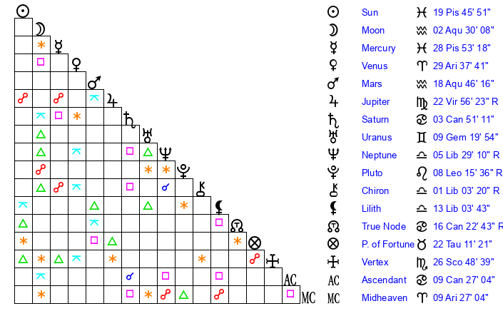 | Sun | 19 Pisces 46 | 20 Pisces 22 | 7 Gemini 56 |