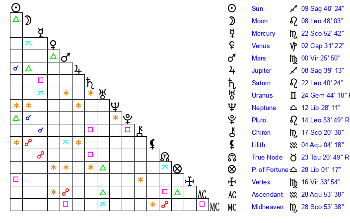 | Moon | 8 Leo 33 | 8 Taurus 43 | 6 Gemini 50 |