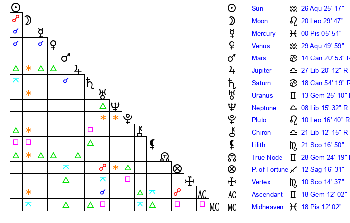 | Sun | 26 Aquarius 25 | 27 Aquarius 16 | 14 Taurus 35 |