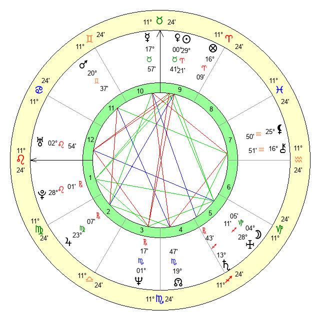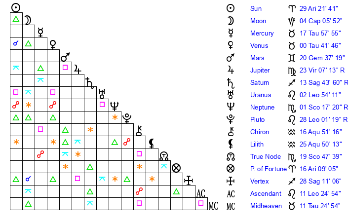 | Venus | 0 Taurus 42 | 25 Pisces 29 | 24 Cancer 13 |