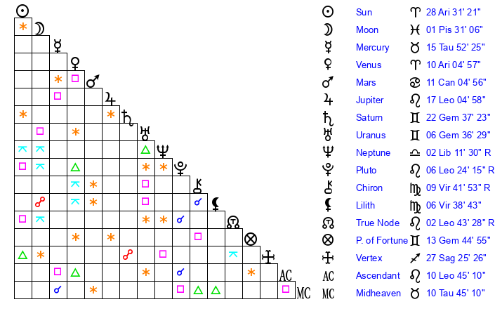 | Sun | 28 Aries 32 | 28 Aries 54 | 16 Cancer 22 |