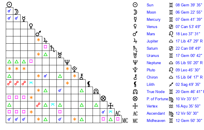 | Sun | 8 Gemini 40 | 9 Gemini 32 | 24 Leo 10 |