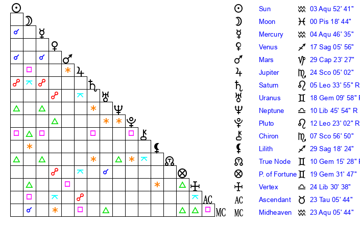 | Moon | 0 Pisces 23 | 6 Sagittarius 16 | 12 Capricorn 4 |