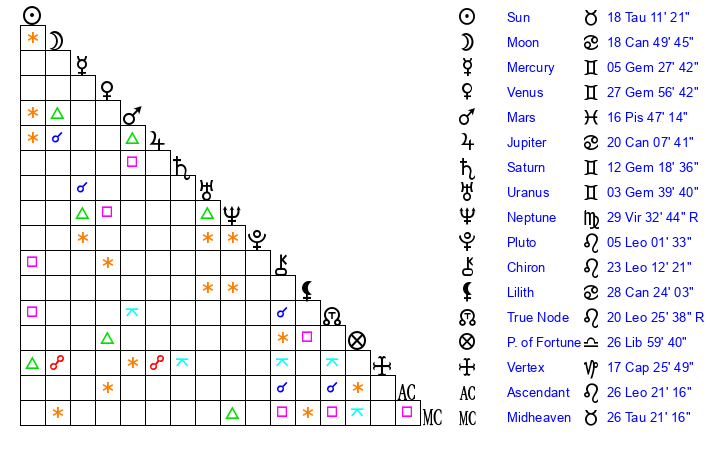 | Moon | 18 Cancer 48 | 16 Libra 39 | 20 Cancer 45 |