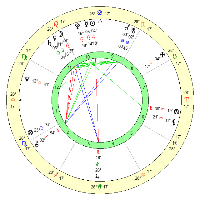 | Moon | 29 Leo 36 | 10 Virgo 48 | 8 Gemini 0 |