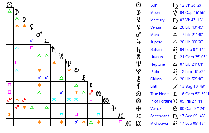 | Venus | 28 Libra 40 | 13 Leo 10 | 21 Scorpio 23 |