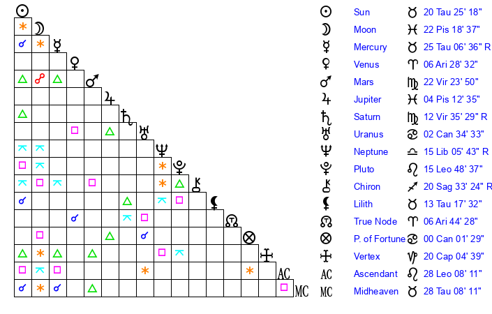 | Mercury | 25 Taurus 6 | 2 Taurus 3 | 17 Leo 25 |