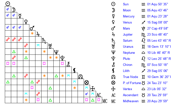 | Moon | 5 Aquarius 47 | 12 Scorpio 2 | 18 Sagittarius 24 |