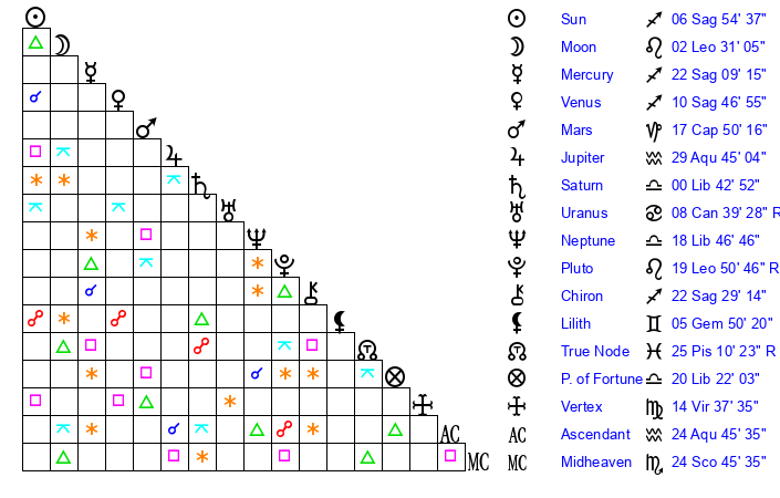 | Sun | 6 Sagittarius 55 | 7 Sagittarius 43 | 23 Aquarius 11 |