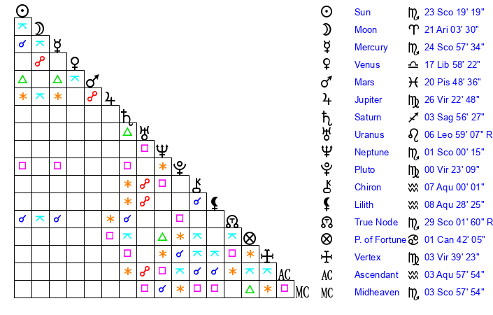 | Neptune | 1 Scorpio 0 | 29 Pisces 32 | 2 Scorpio 34 |