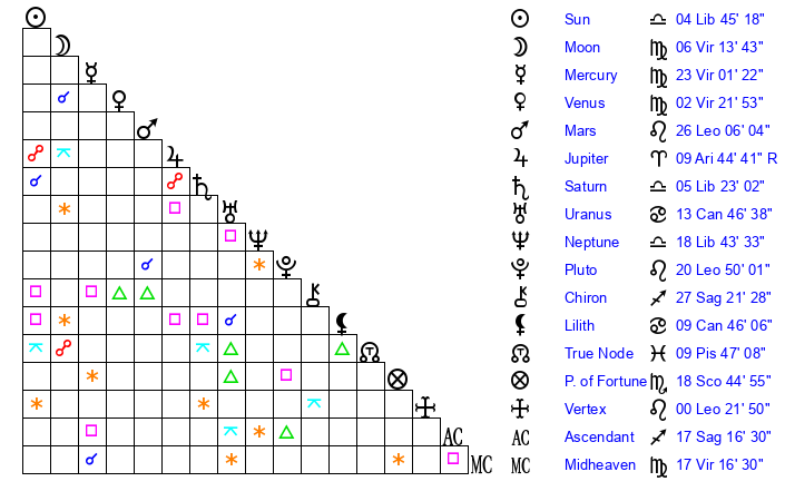 | Sun | 4 Libra 45 | 5 Libra 49 | 18 Sagittarius 51 |
