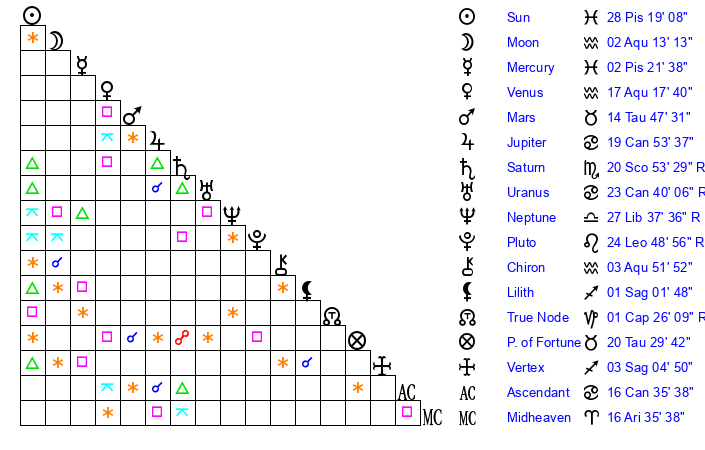 | Moon | 2 Aquarius 4 | 28 Scorpio 12 | 8 Virgo 13 |