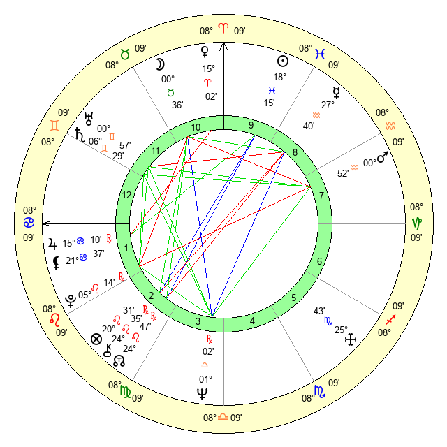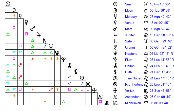 | Moon | 0 Taurus 38 | 26 Cancer 47 | 0 Taurus 12 |