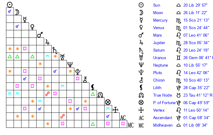 | Moon | 26 Libra 7 | 3 Leo 23 | 2 Virgo 57 |