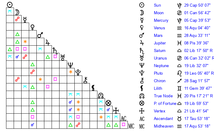| Sun | 29 Capricorn 50 | 0 Aquarius 53 | 14 Aries 7 |