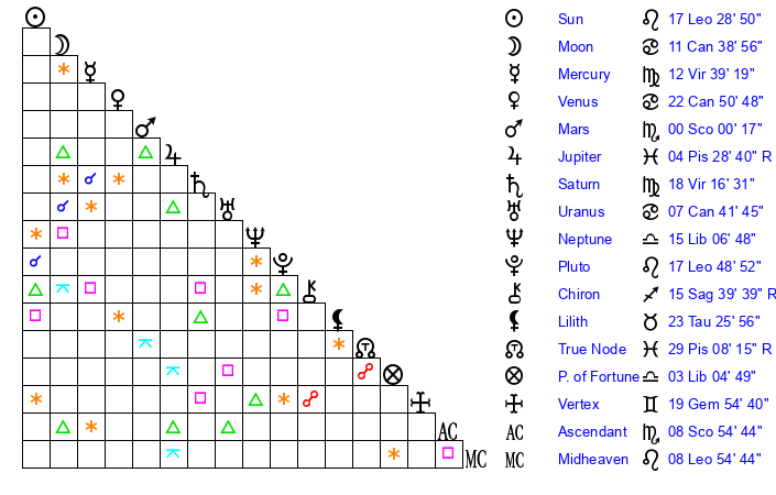 | Sun | 17 Leo 29 | 18 Leo 19 | 0 Scorpio 43 |