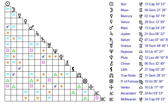 | Sun | 13 Capricorn 30 | 14 Capricorn 21 | 3 Aries 13 |