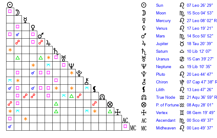 | Venus | 17 Leo 19 | 29 Gemini 28 | 17 Scorpio 9 |